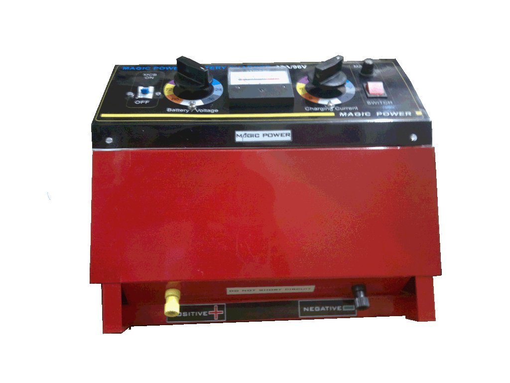 This Battery Charger Supports all types of Automobile batteries and Inverter Batteries. Its capacity is to charge Eight batteries at a time in series connection. Other feature include selector switch between 12 Volts and 96 Volts, Current controller to adjust the current as per the battery. This Charger Supports all Brand batteries from Exide, Amron, Bosch, Exide Invva,etc . It is a Heavy Duty Charger from the Brand Magic Power all our chargers are of best quality and tested. The MAGIC POWER 96V 10A battery CHARGER is a high quality charger designed to provide excellent performance, durability and long life. This charger meets or exceeds the original manufacturers specifications. Our chargers are new and always fresh stock. Buy with Confidence