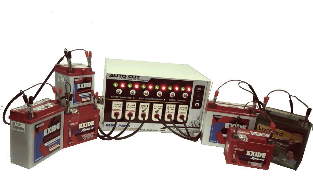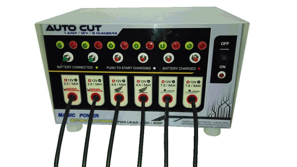 This Battery Charger Is specially designed to charge all types of two wheeler batteries rated at 12V, It is a Heavy Duty Charger to charge almost SIX batteries at a time with individual connection, it also comes with auto cut off feature which switch off the supply after battery gets fully charged. Other features include reverse battery indicator then charger comes with Six output charging cable with easy to connect Alligator clips.This Charger Supports all Brand batteries from Exide, Amron, Bosch, Exide Invva,Sunca,Akari,Meri,Tata etc. It is a Heavy Duty Charger from the Brand Magic Power all our chargers are of best quality and tested. The MAGIC POWER "SIX IN ONE" battery CHARGER is a high quality charger designed to provide excellent performance, durability and long life. This charger meets or exceeds the original manufacturers specifications. Our chargers are new and always fresh stock. Compatible Battery includes: 12V 2.5Ah,12V 3Ah,12V 4Ah, 12V 5Ah, 12V 7Ah,12V 9Ah Lead Acid and Alkaline batteries. Buy with Confidence.